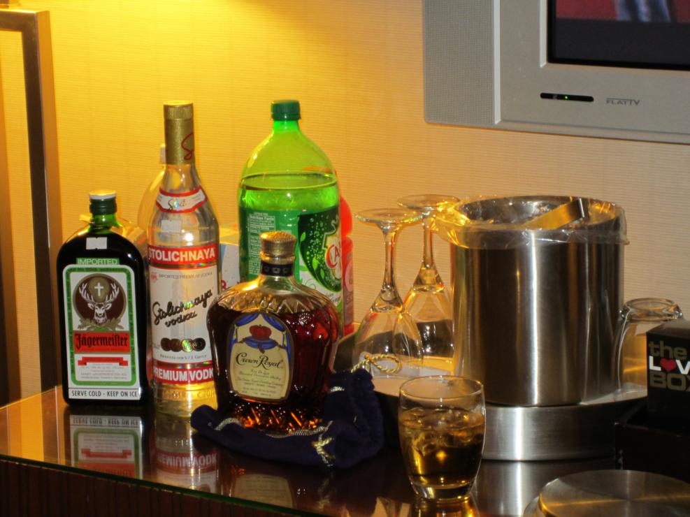 I have to get back to my office computer to post any of my drunken pics of the pregame bar I put together in the room for my last trip.